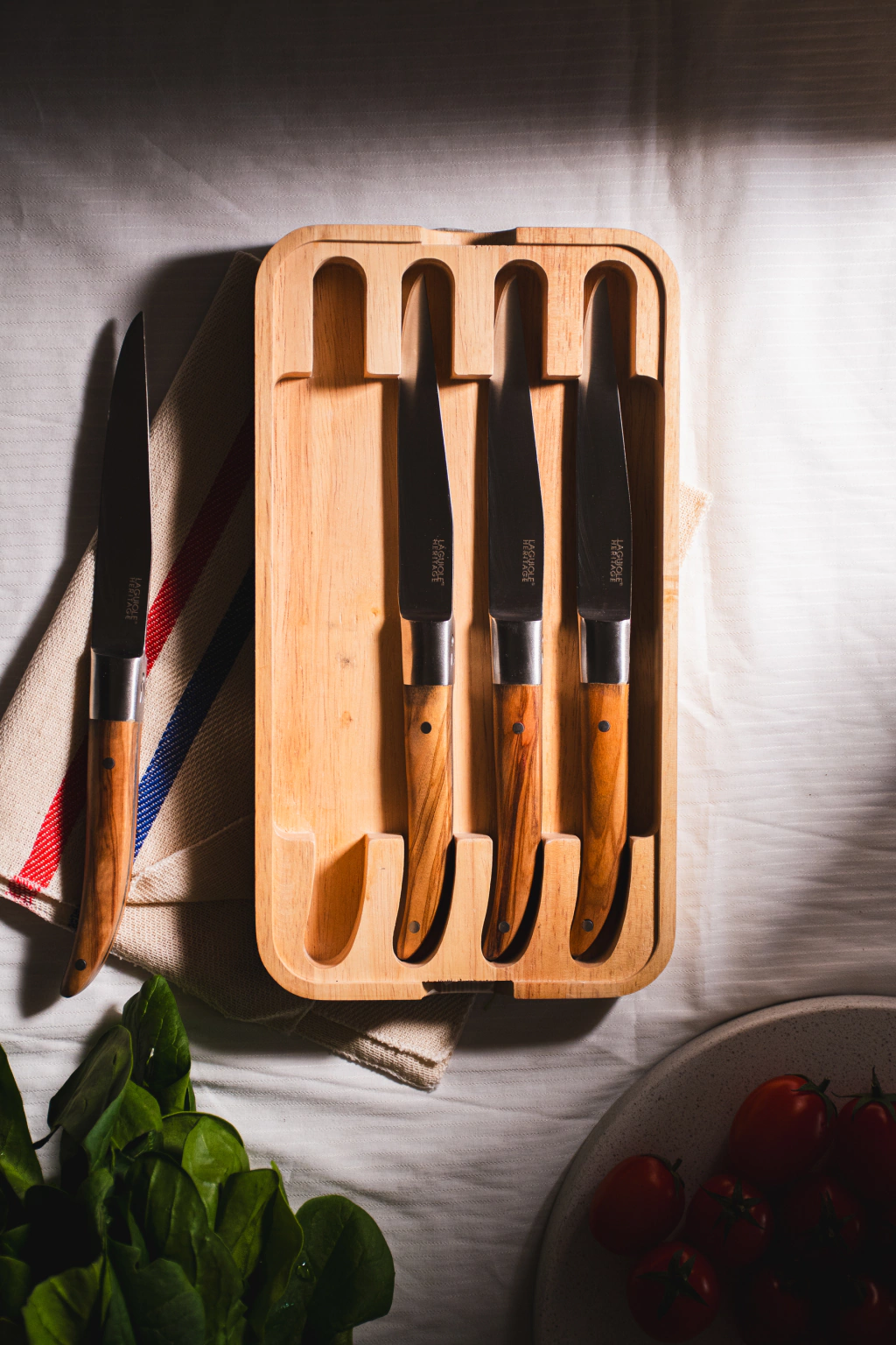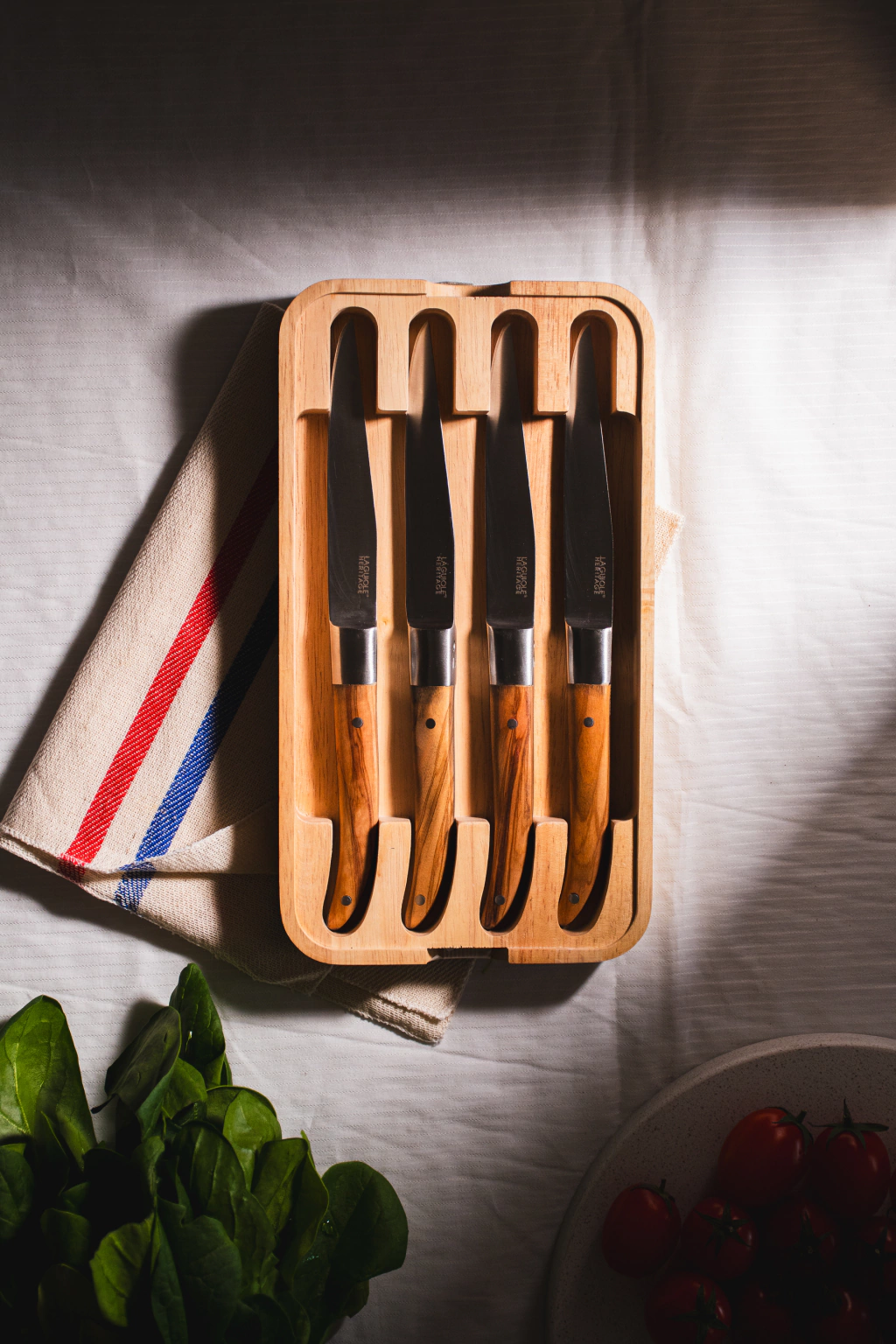 Este juego de cocina se compone de 4 cuchillos para carne cuya hoja de 11 cm permite utilizarlos como cubiertos de mesa o como cuchillos de cocina. Equipados con un elegante mango de madera de olivo. Son perfectos para cortar eficientemente todas las carnes, son muy populares entre los cocineros.